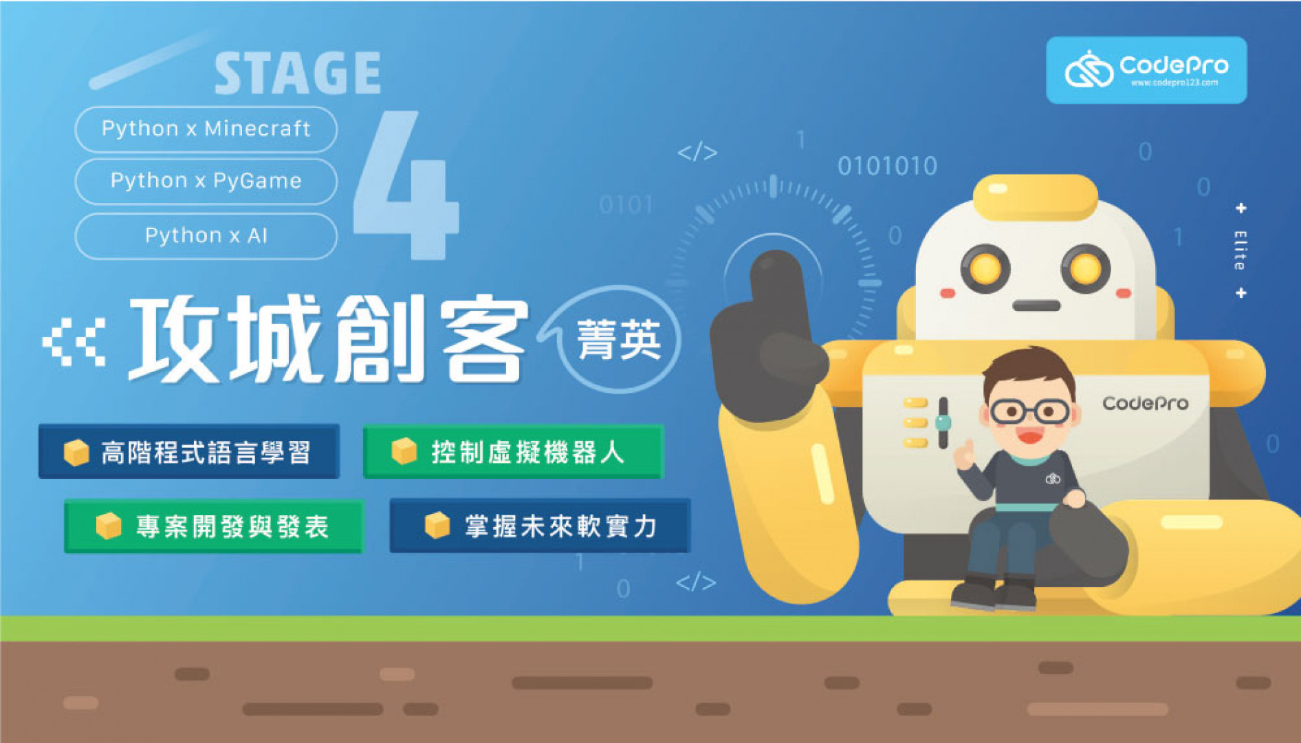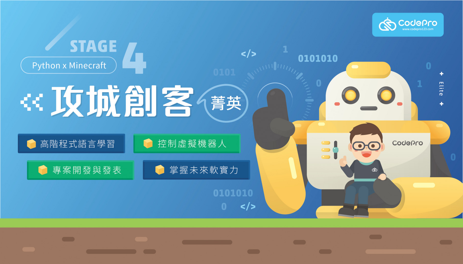 階段 4 攻城創客菁英為文字式程式語言課程,課程中將使用 Python 引導學生延續階段 2、階段 3 所學習之運算邏輯觀念與 Debug 等程式技巧製作自己的專題、了解 AI 人工智慧原理。階段 4 攻城創客菁英的學習目標為:「培養學生自我學習能力」與「啟發孩子對於程式設計的想像」並透過知識應用持續讓學生練習使用 CoPower 核心 3 力(問題解決力、情緒管理力與演說表達力)。階段 4 課程將奠定學生未來通過 Certiport IC3 GS6 Lv1 ,於階段 4 課程完成後可參加 ITS 國際認證培訓班。